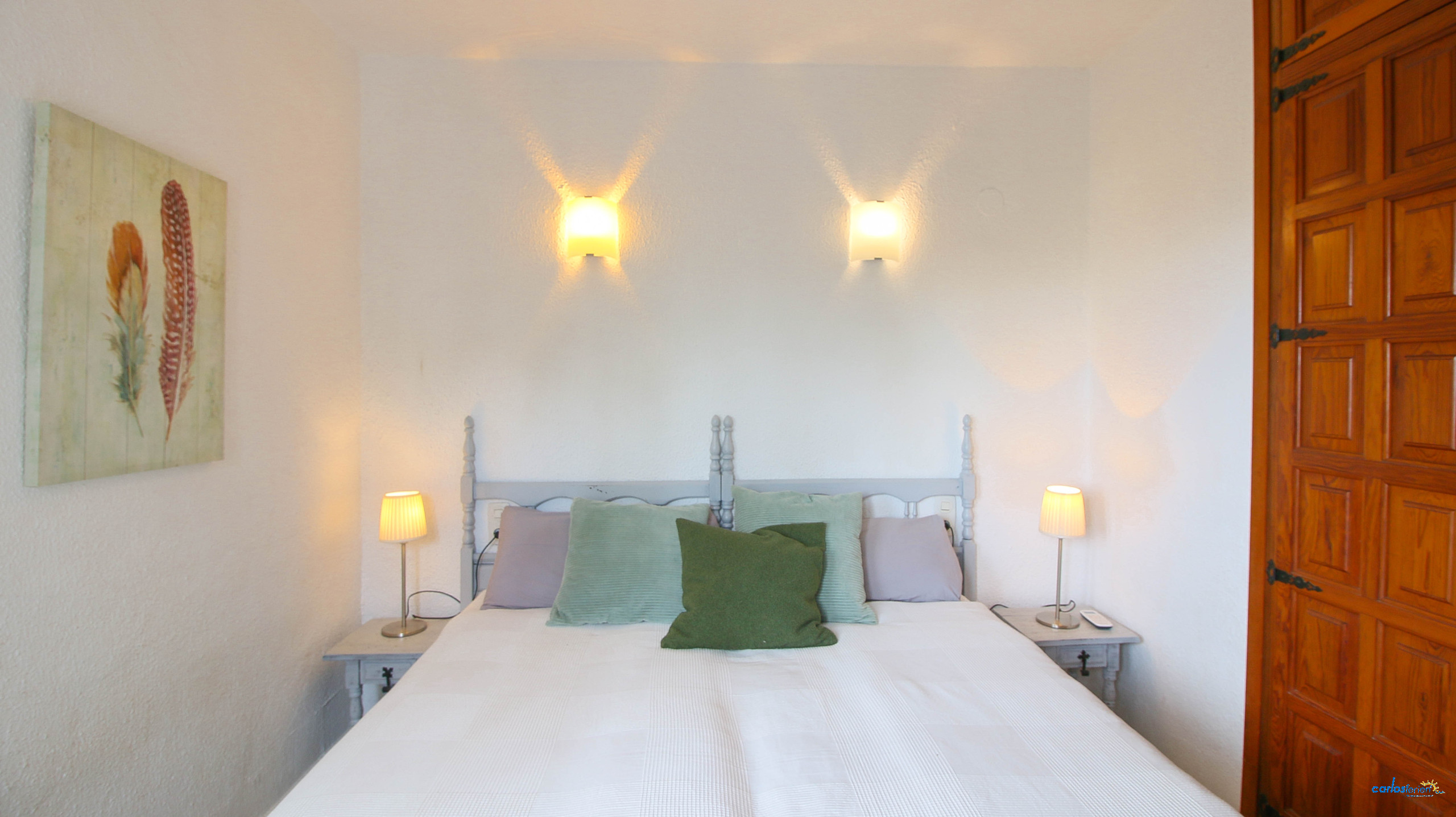 Casa vacacional junto a la montaña de Dénia con bonitas vistas panorámicas a la ciudad, el puerto y el mar. El jardín consta de palmeras, cactus y demás plantas variadas. Del aparcamiento cubierto se llega a través de algunos escalones a la entrada principal de la casa, con un salón-comedor con TV y aire acondicionado en todo el alojamiento. Hay dos dormitorios dobles con aire acondicionado.