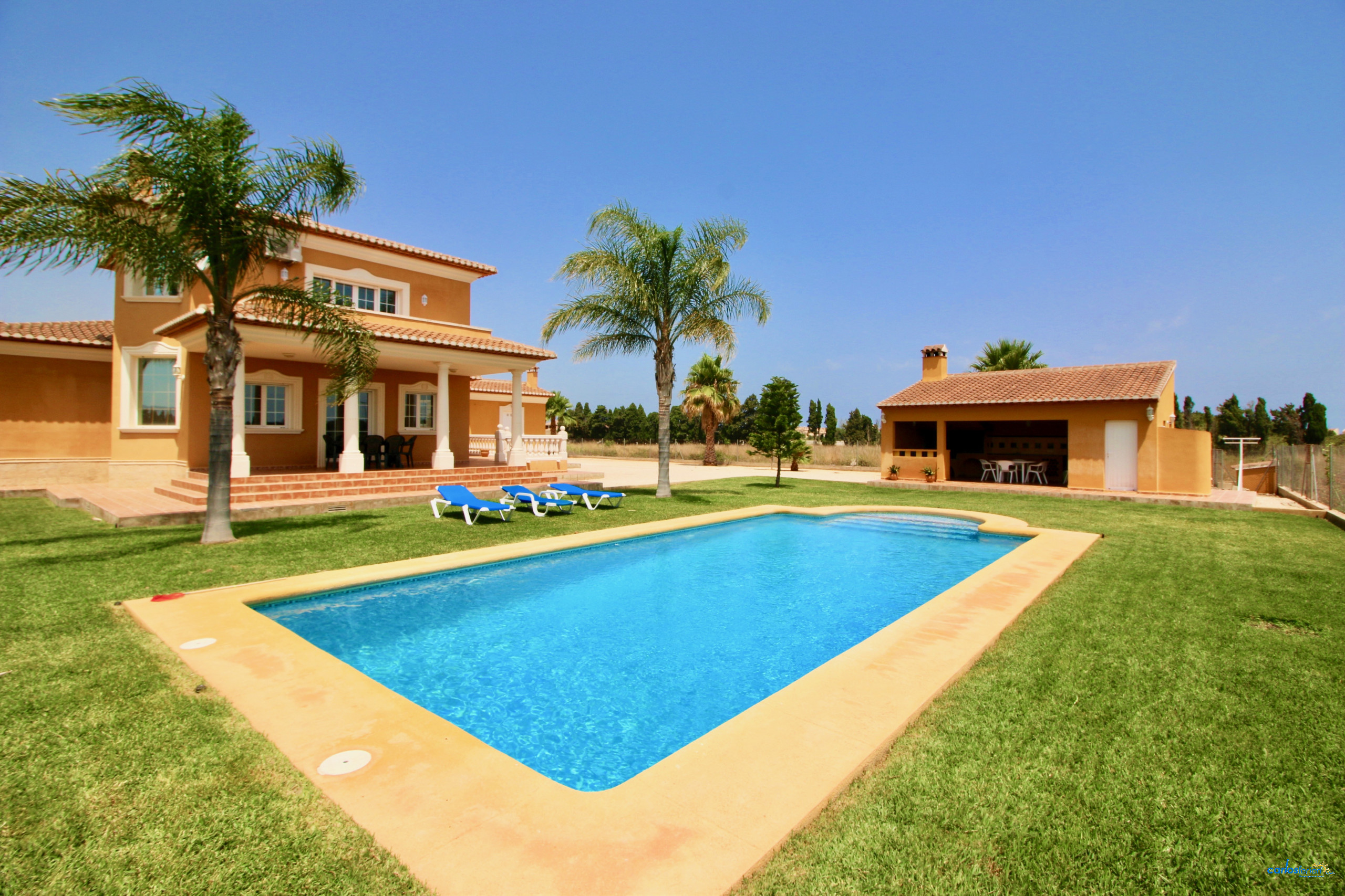 Al entrar en la parcela descubrimos el imponente jardín compuesto de amplias zonas de césped, palmeras y una gran piscina. Junto a la misma podemos encontrar una zona de barbacoa totalmente amueblada, así como un cuarto de baño exterior para mayor comodidad.