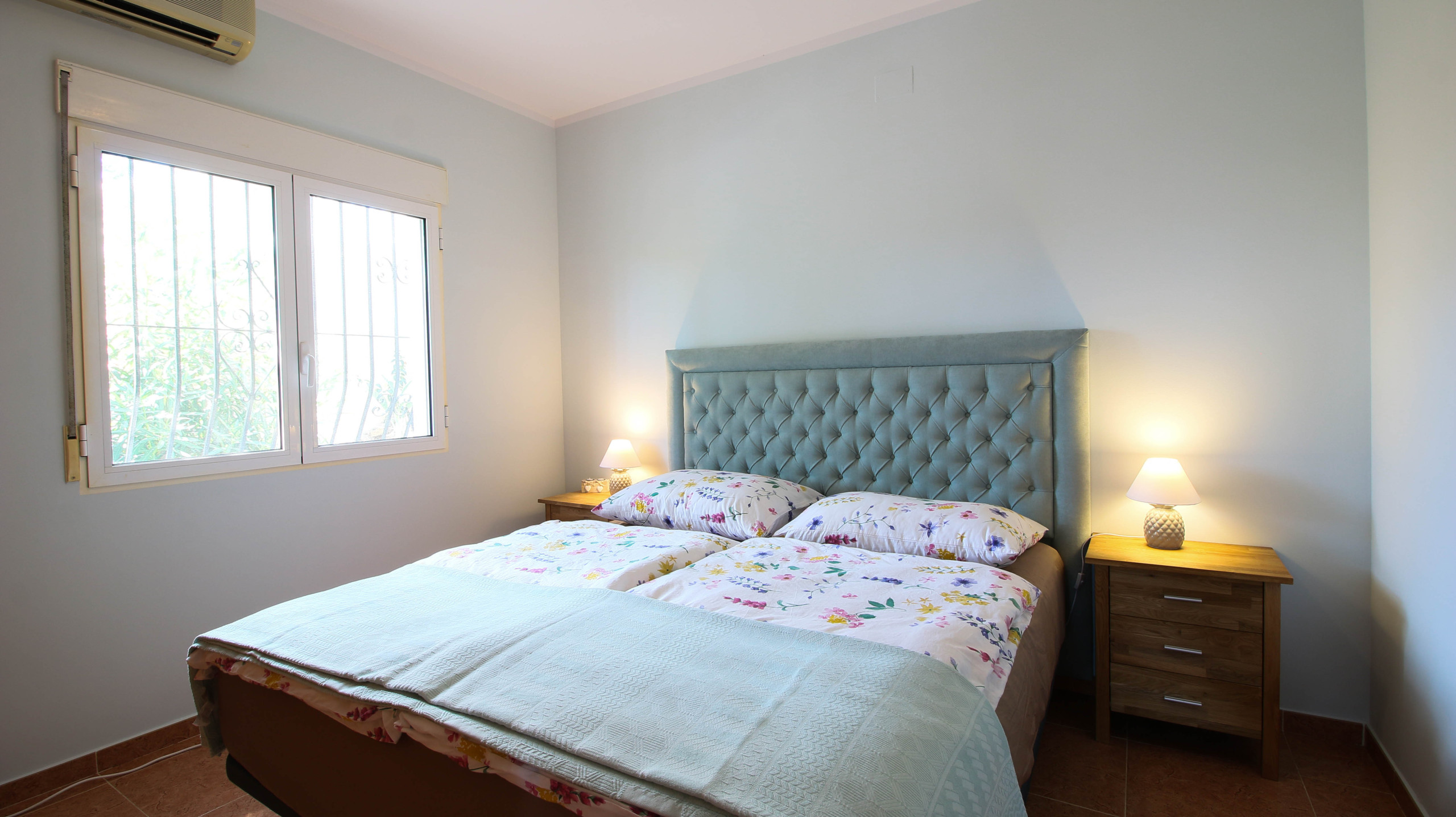 Neben dem Esszimmer hat es zwei Schlafzimmer und ein Badezimmer. Das Hauptschlafzimmer verfügt über ein Doppelbett, zwei Nachttische und zwei Lampen sowie einen Einbauschrank. Das zweite Schlafzimmer besteht aus zwei Einzelbetten, einer Kommode mit Spiegel und einem Einbauschrank. Beide Zimmer mit Klimaanlage (warm/kalt).
