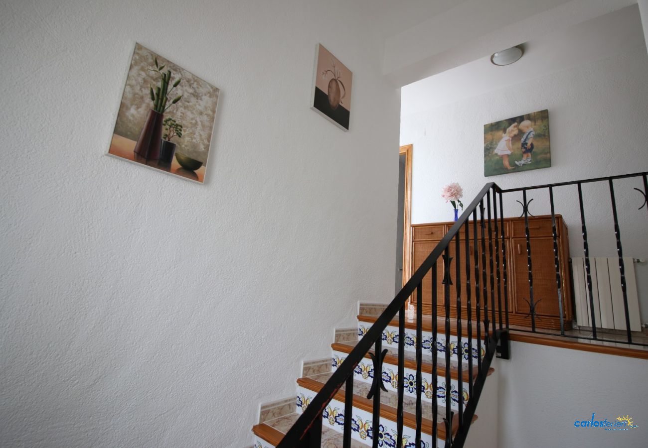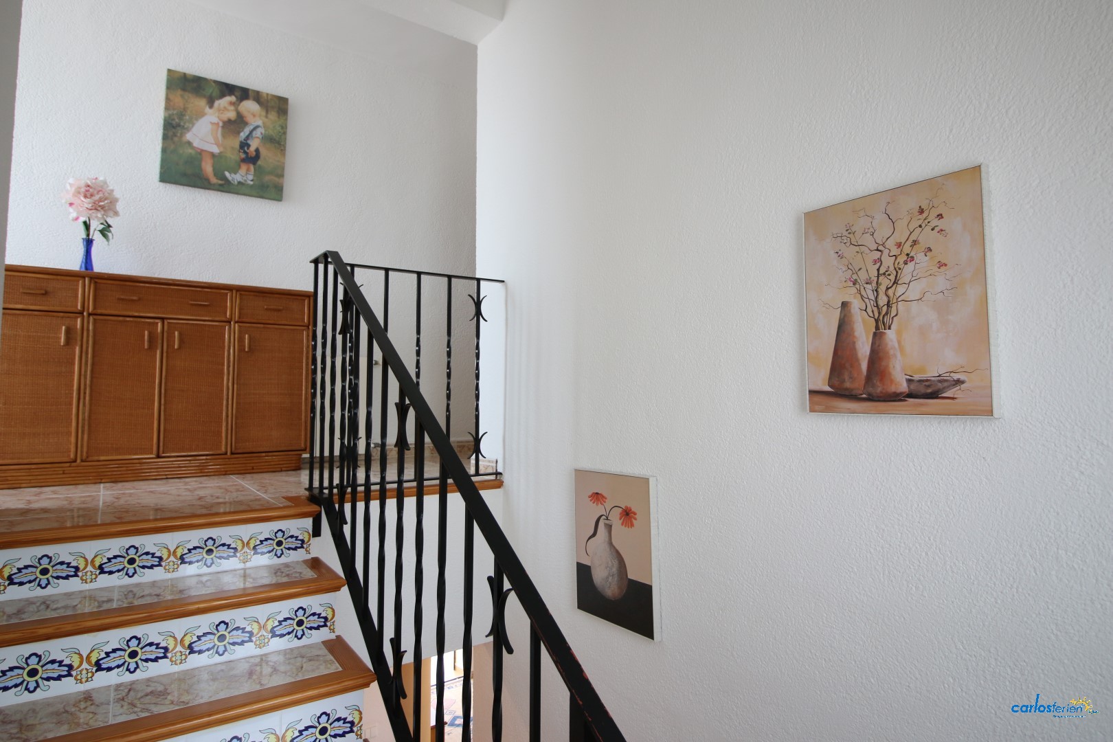 Das zweistöckige Haus hat 130m2 und ist wie folgt aufgeteilt: Im Erdgeschoss befindet sich der Wohnbereich mit Satelliten-TV und Zugang zur Terrasse, neben dem Wohnzimmer liegt der Essbereich mit dem Flur, der zur voll ausgestatteten Küche führt, mit Gasherd, Ofen, Mikrowelle, Geschirrspüler, Kapsel-Kaffeemaschine und Filterkaffeemaschine sowie einem Kühlschrank mit Gefrierfach. Im Abstellraum befindet sich die Waschmaschine.