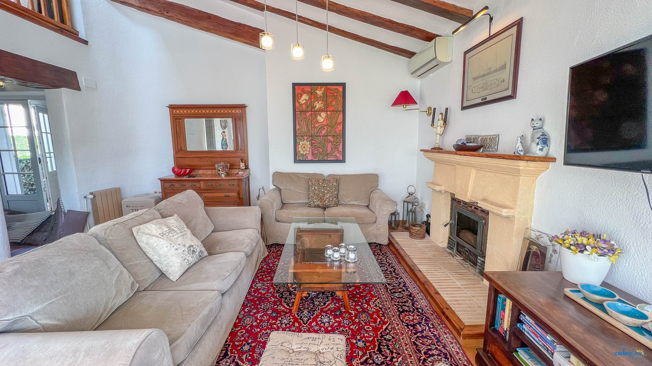 The kitchen, completely independent and equipped with induction, includes appliances such as washing machine, dishwasher, oven, microwave, coffee maker, toaster, and a wide variety of kitchenware. The living area stands out with a fireplace, perfect for moments of gathering and comfort.
