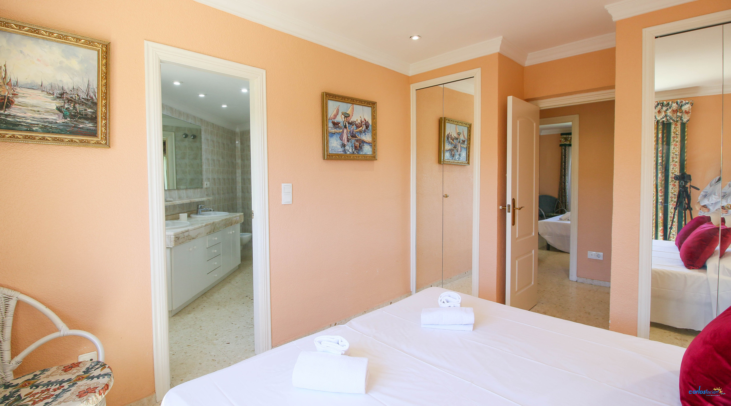 Crossing the hallway, we find the guest toilet and beyond it the bedrooms. The first one has a newly purchased double bed (2024) and an en-suite bathroom. Secondly, there is the second bedroom with a newly purchased double bed (2024) and a shared en-suite bathroom with the third bedroom, which consists of a bunk bed and a single bed.