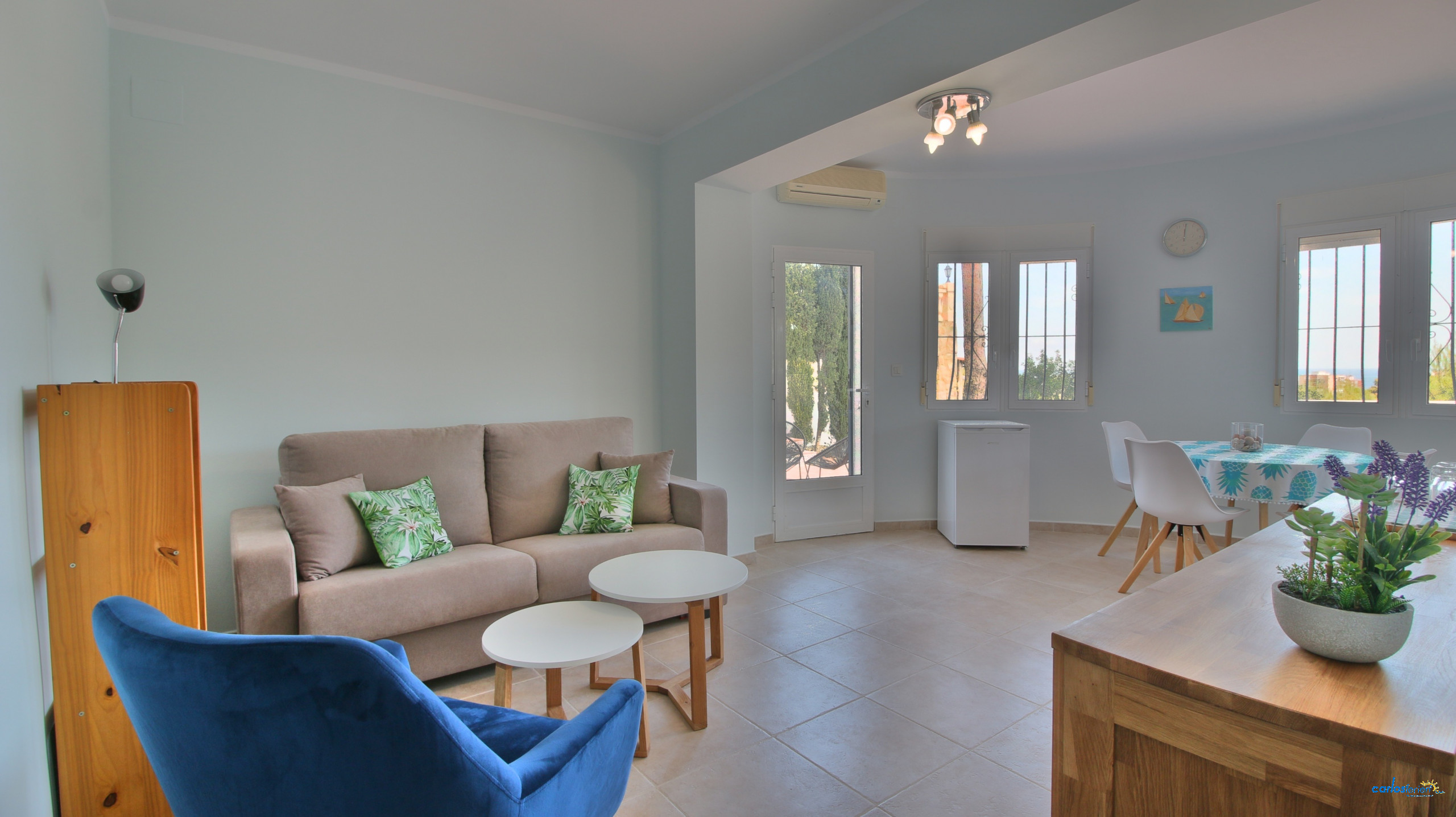 Once inside the house, we find the spacious living-dining room with Spanish and German TV, air conditioning and from its windows we can enjoy one of the best parts of this property, its sea views. The American kitchen is equipped with everything necessary such as Nespresso coffee machine, fridge with freezer, toaster, water kettle, all necessary kitchenware, juicer, gas cooker, oven, etc.