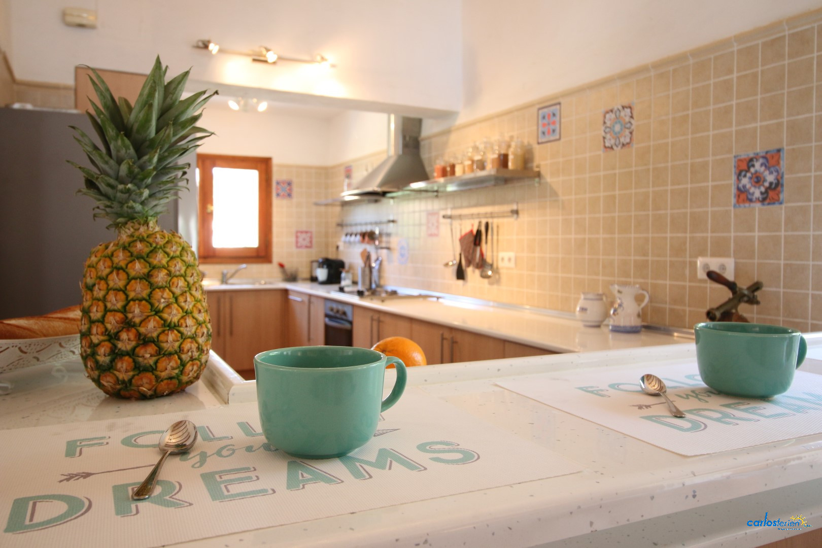 The American kitchen is at the entrance of the house and contains all amenities such as gas cooker, oven, American fridge, microwave and a bar with 4 stools.