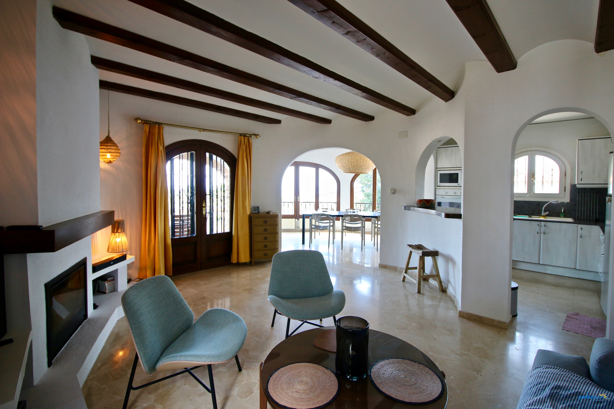 From the spacious dining room with a fireplace is where we find the best views of the house. From its large windows, Denia and its bay can be perfectly seen. In addition, it has access to a covered terrace perfect for dining on the mild winter days of the Costa Blanca.