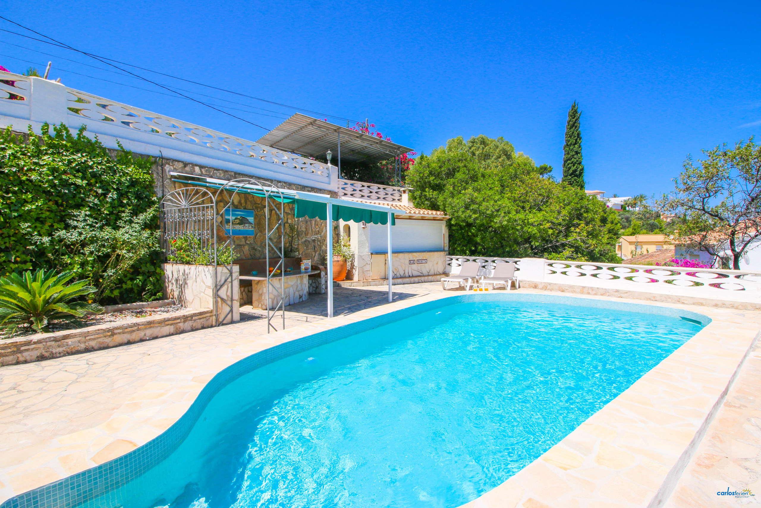 Going up the stairs, we find the third level, where the house is located. Upon entering, there is a reception area with a courtesy toilet. From there, access is gained to the living-dining room, with air conditioning, which has impressive views of the city and Denia bay. It has a fireplace and a door accessing the terrace. The flat-screen TV has satellite, so guests can enjoy TV in several languages.