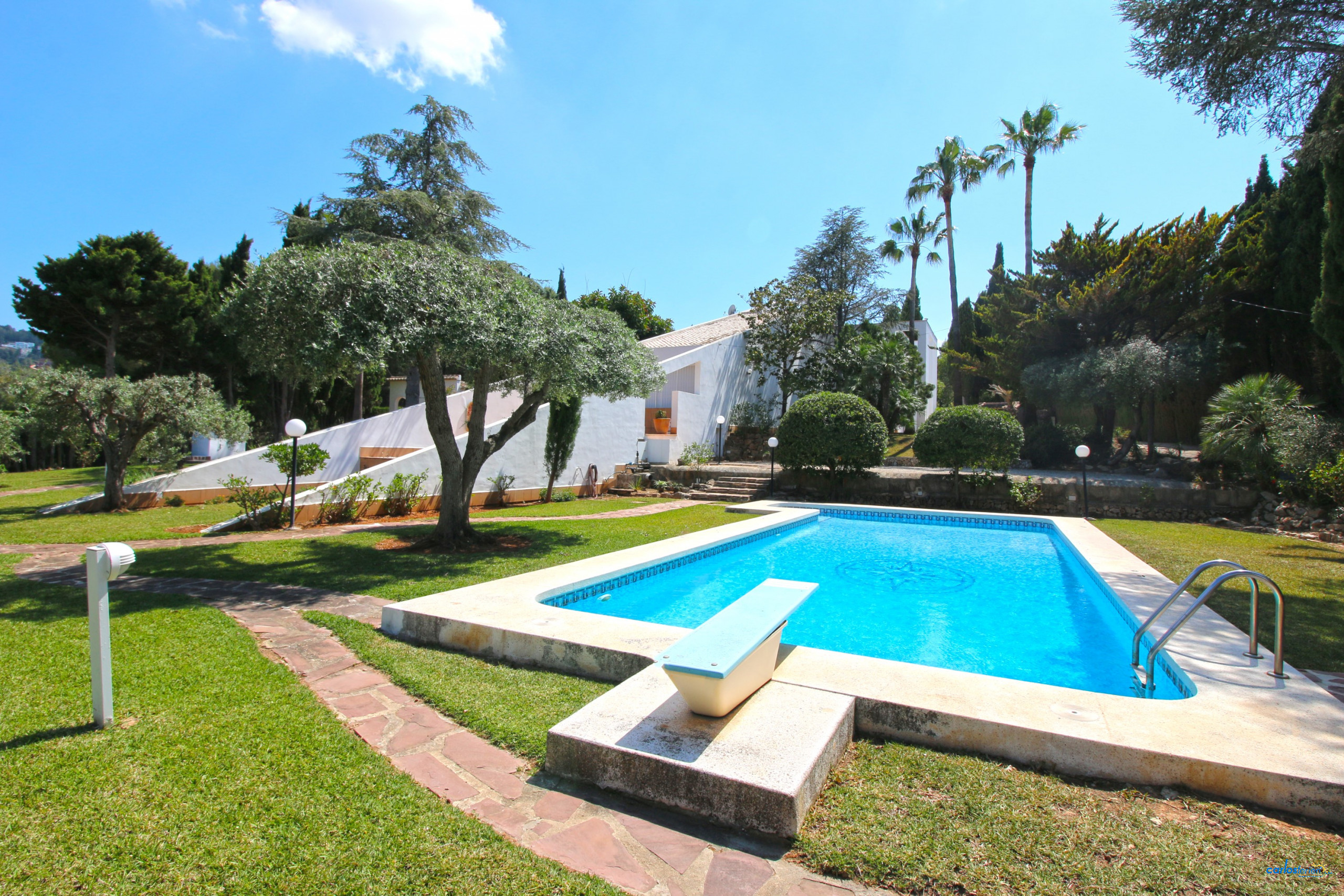 Spacious and beautiful modern-style estate on a fenced plot of 4,000m2 in a quiet location within the Montgó Natural Park. Large wooded garden with a variety of plants, palm trees, and lawn. Covered barbecue with cooking possibility. 14x5m swimming pool with Roman steps and diving board. From the house entrance, access is provided to the upper floor on one side, where you'll find a double bedroom (1.50m bed) with sea views and a bathroom with shower. A living room with TV/SAT and fireplace with access to the back garden.
