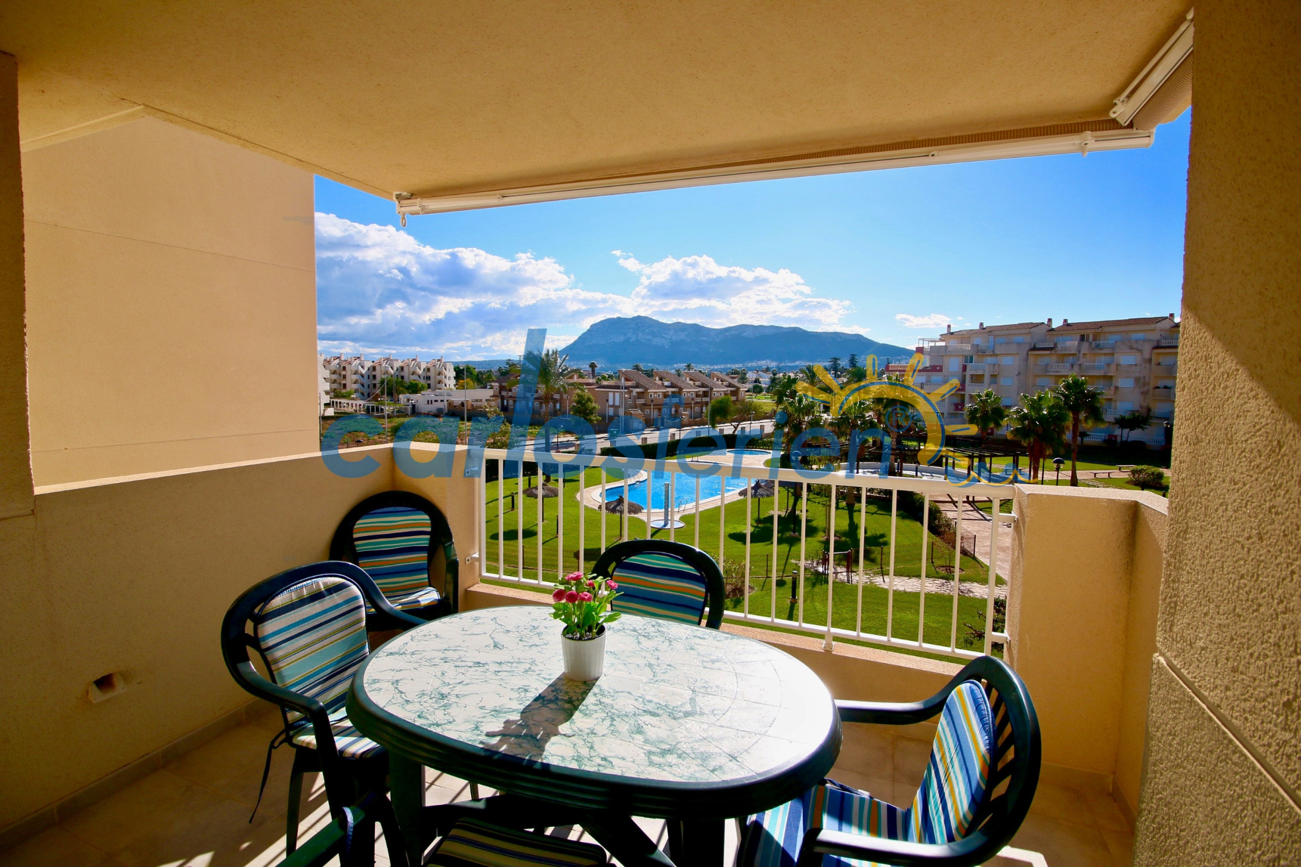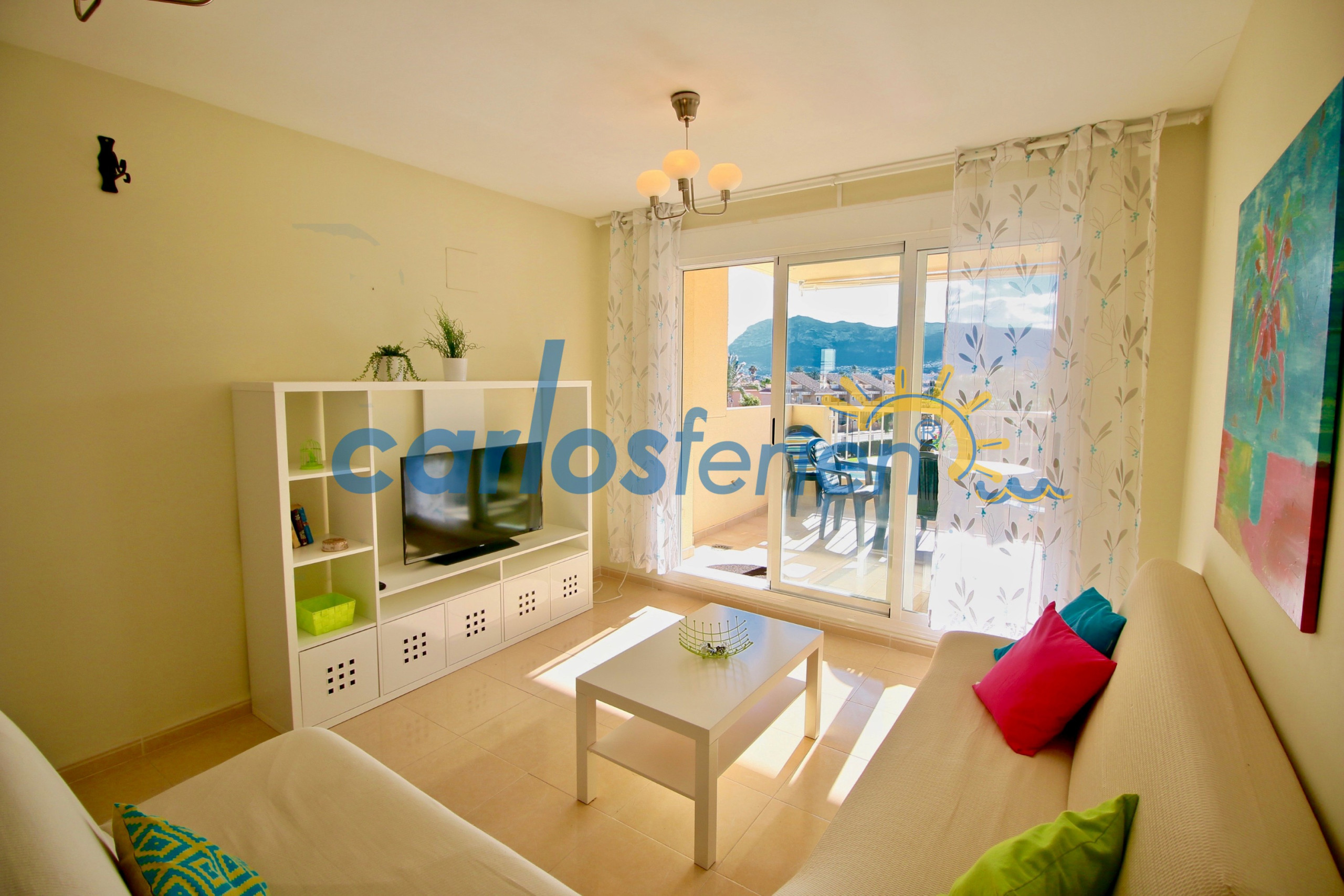 The property, with a built area of 90 m², stands out for its excellent south-facing orientation, which guarantees natural light throughout the year and a warm and welcoming atmosphere in any season. It features a master bedroom with an en-suite bathroom, a second double bedroom, an additional full bathroom, an independent kitchen with a gallery and laundry area, and a spacious living-dining room with direct access to a private terrace with open views of the community pool and Montgó.