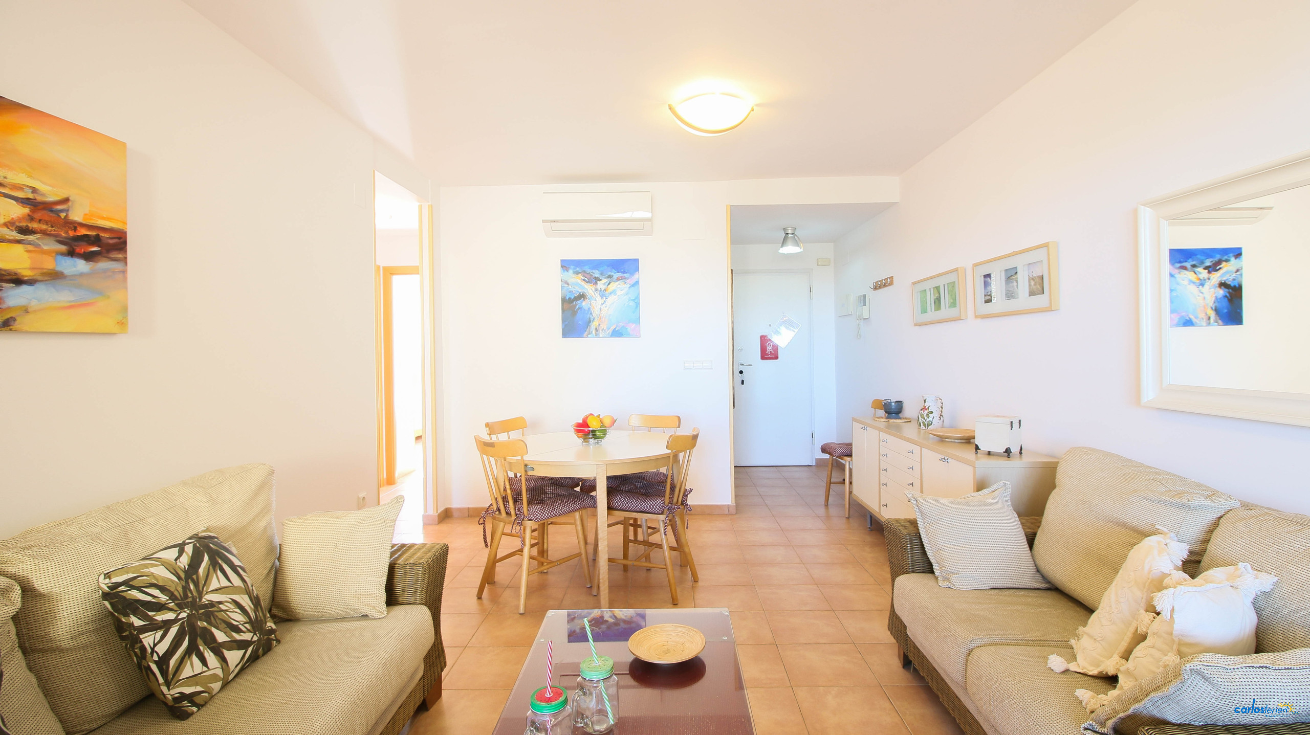 Le logement se trouve au 3ème étage avec ascenseur. En entrant, on se trouve dans le salon-salle à manger qui dispose de TV/TNT, connexion Wifi gratuite, climatisation et une sortie sur la terrasse, laquelle est meublée et offre une vue sur la piscine et la mer.