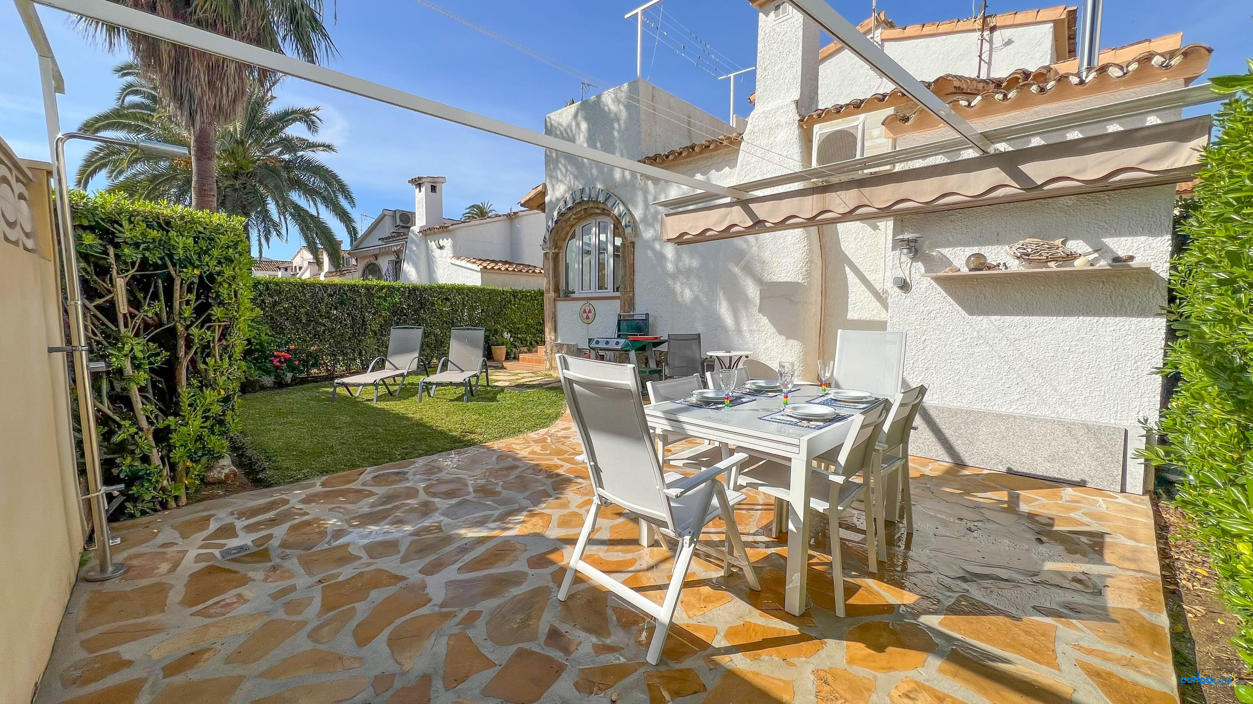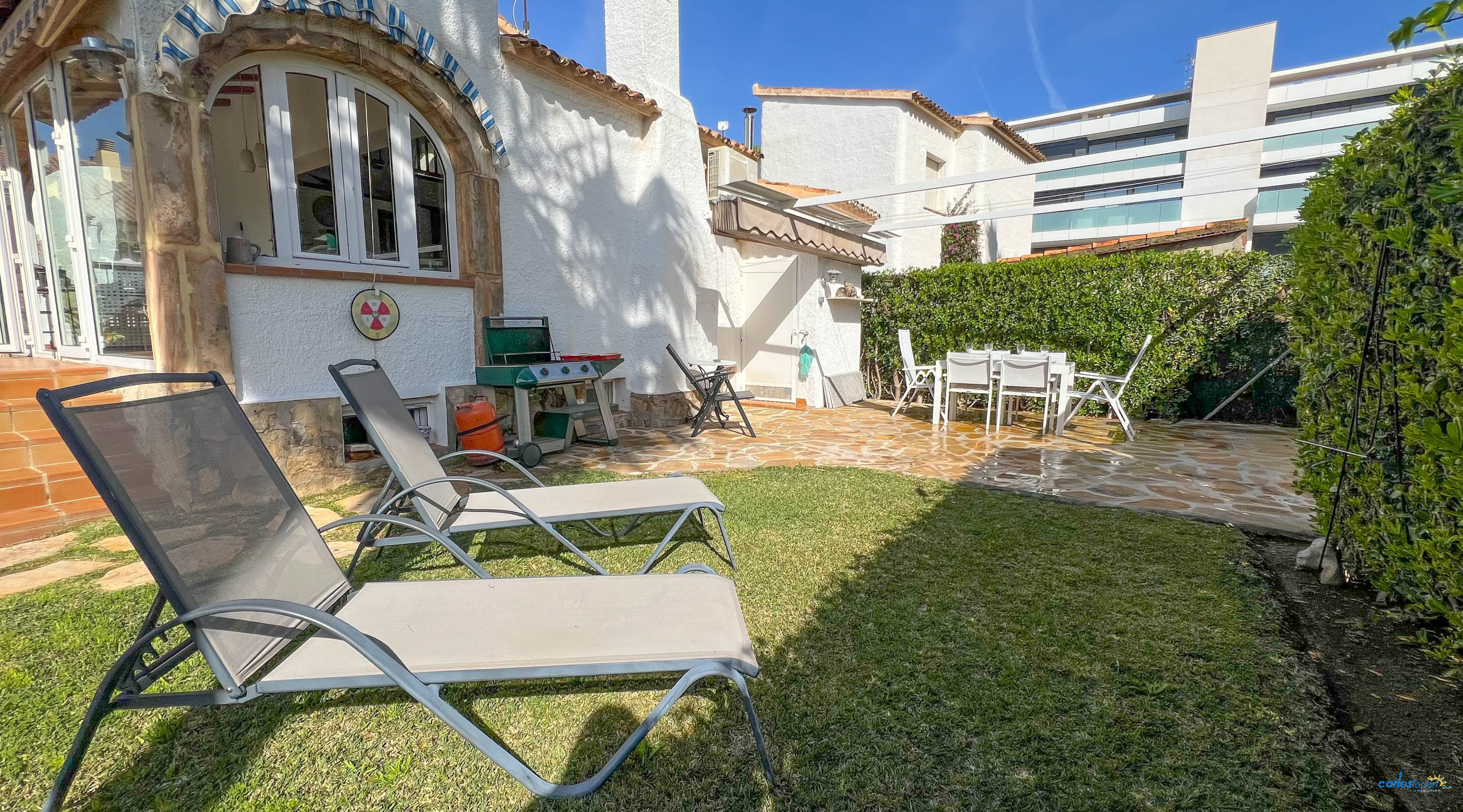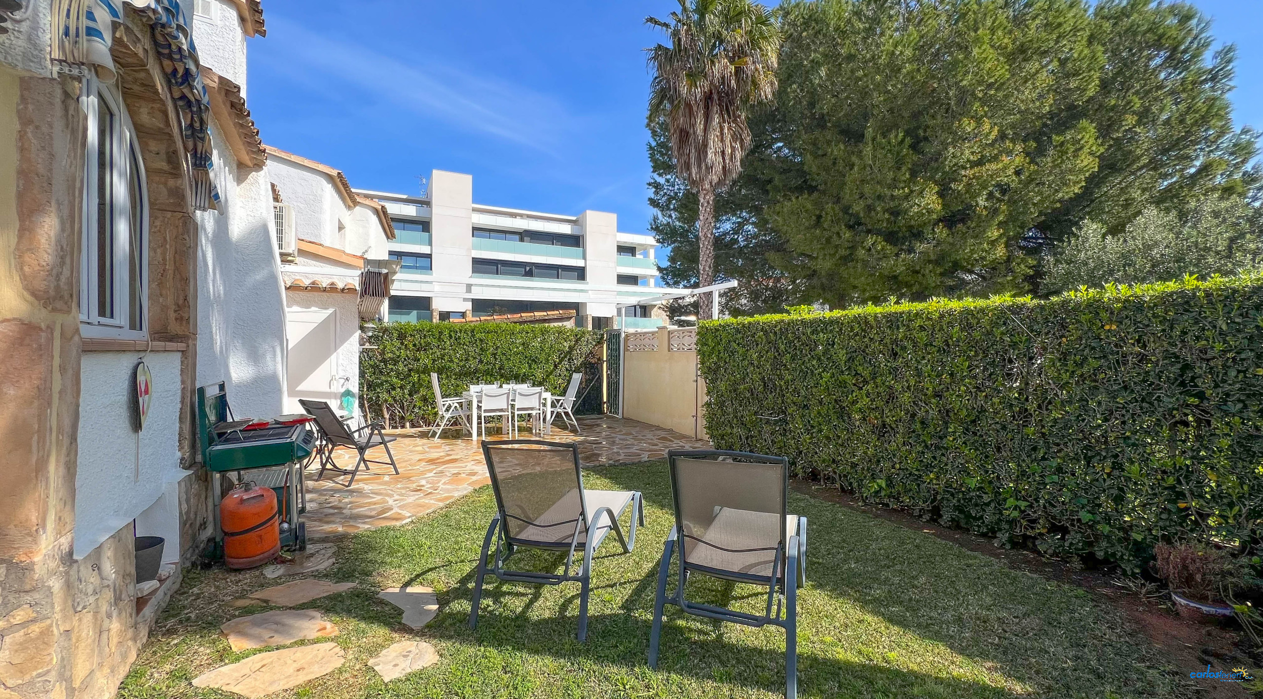 À l'extérieur, les invités pourront profiter d'un jardin privé, meublé avec des meubles de jardin, un barbecue et une terrasse. La parcelle est entièrement clôturée, offrant intimité et sécurité. Il comprend également une place de parking privée en plein air.