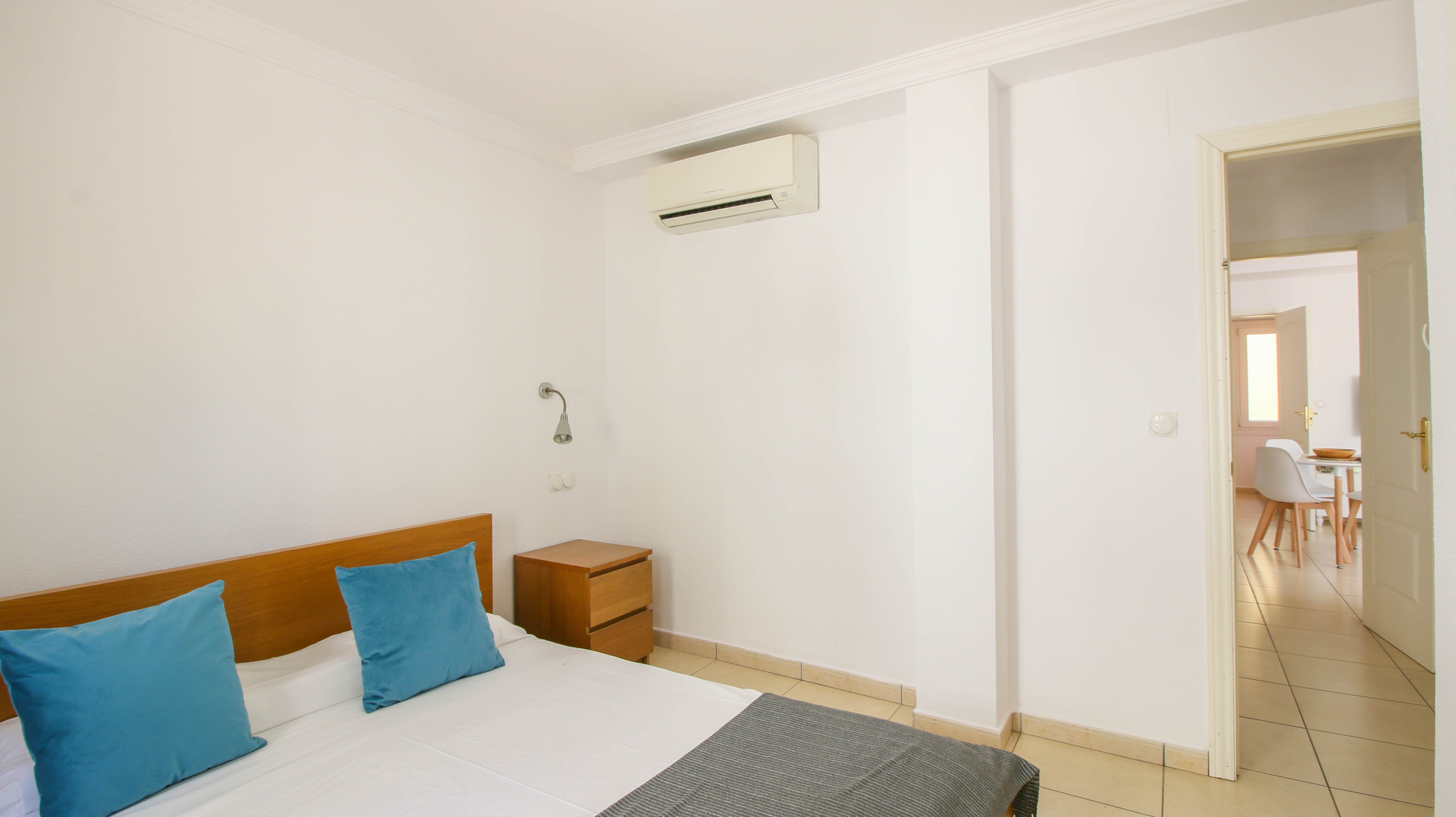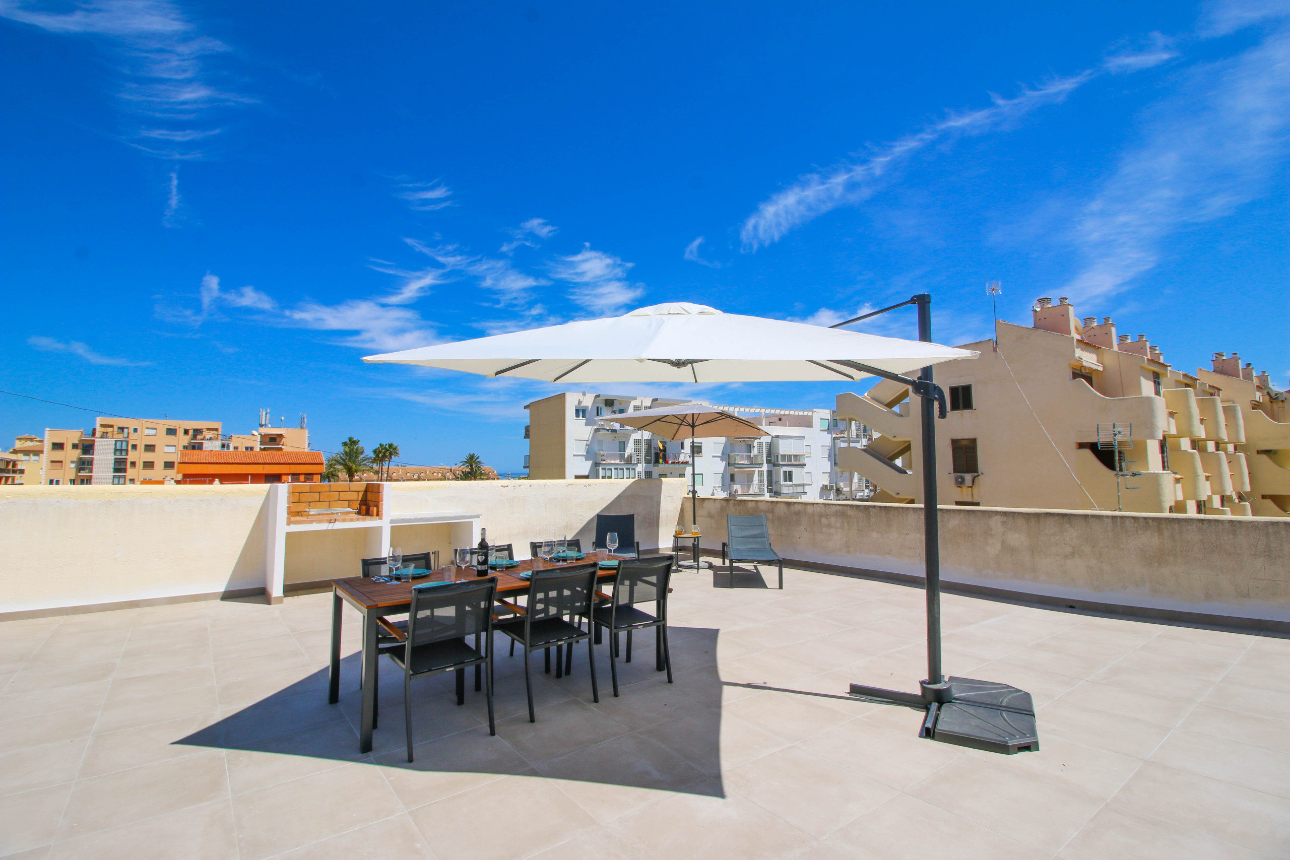 À vendre, un appartement chaleureux dans l'urbanisation Résidentielle La Felicidad, à Dénia, à quelques pas de la plage de Las Marinas. D'une superficie de 80m², ce logement propose deux chambres, une salle de bain complète, un salon-salle à manger avec cuisine américaine et un accès à une grande terrasse privée sur le toit de plus de 220m2 à usage privatif, équipée d'un barbecue, de mobilier extérieur et de transats. L'appartement est en parfait état de conservation, rénové il y a un an.